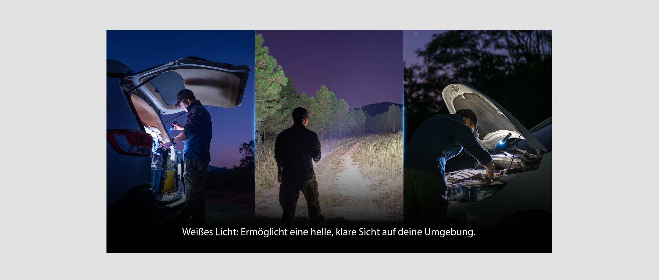 Bei Outdoor-Abenteuern kann Ihnen das leistungsstarke weiße Licht dabei helfen, die Umgebung deutlich zu erkennen und so ein sicheres Fortkommen zu gewährleisten. Beim Nachtcamping reicht die maximale Helligkeit von 1300 Lumen aus, um den gesamten Campingplatz auszuleuchten, sodass Sie ein komfortables Campingerlebnis genießen können. Im täglichen Leben bietet die Weißlichtfunktion des Arkfeld Pro außerdem eine praktische Beleuchtungsunterstützung, sodass Sie die benötigten Gegenstände auch im Dunkeln leicht finden können.