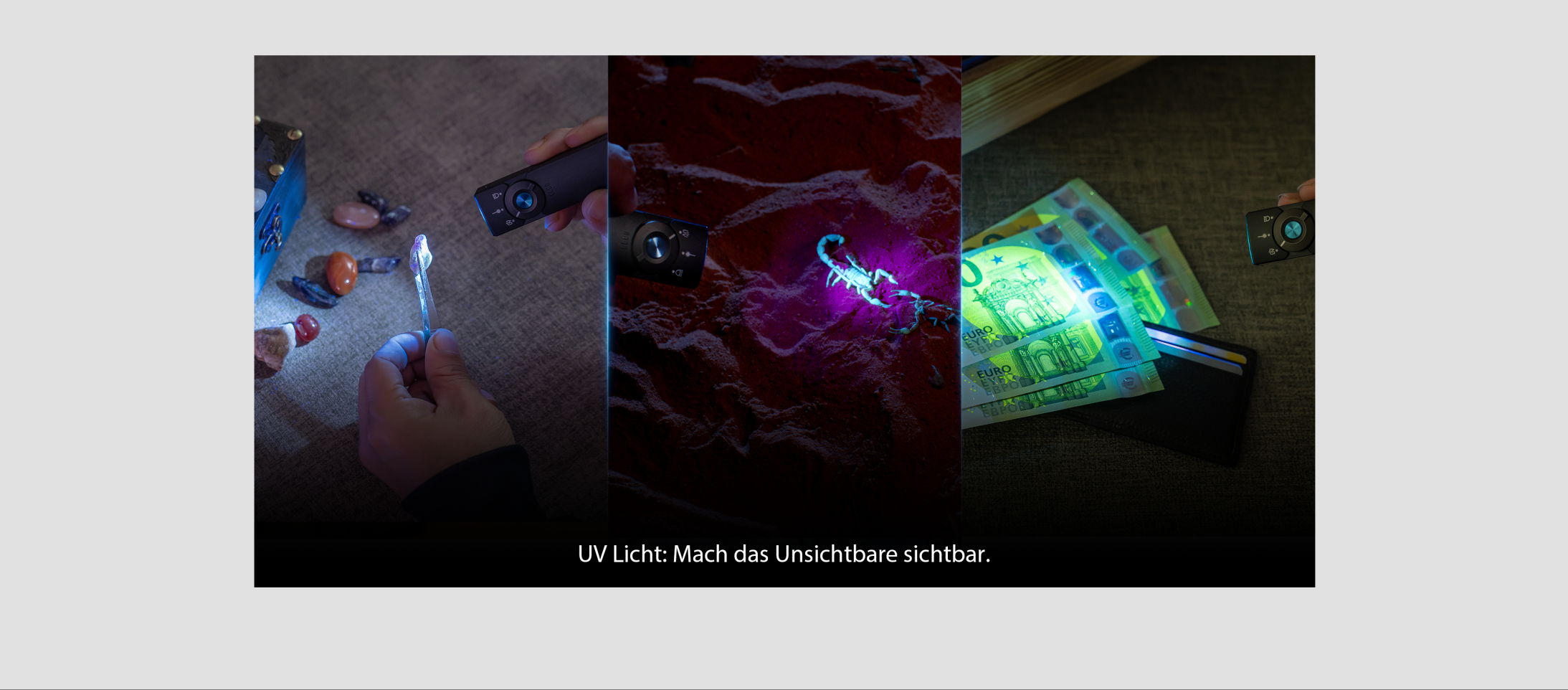 Zusätzlich zur Weißlichtfunktion ist die Arkfeld Pro mit einer leistungsstarken UV-Lichtfunktion ausgestattet. Mit einer Wellenlänge von 365 nm und bis zu 900 mW Leistung ermöglicht ultraviolettes Licht die einfache Erkennung von Fluoreszenzreaktionen auf verschiedenen Oberflächen. Dieses leistungsstarke ultraviolette Licht ermöglicht es Ihnen, verborgene Geheimnisse im Dunkeln zu entdecken und unterstützt Sie bei der Forschung, bei Testarbeiten oder im täglichen Leben, um mehr Möglichkeiten zu erkunden.