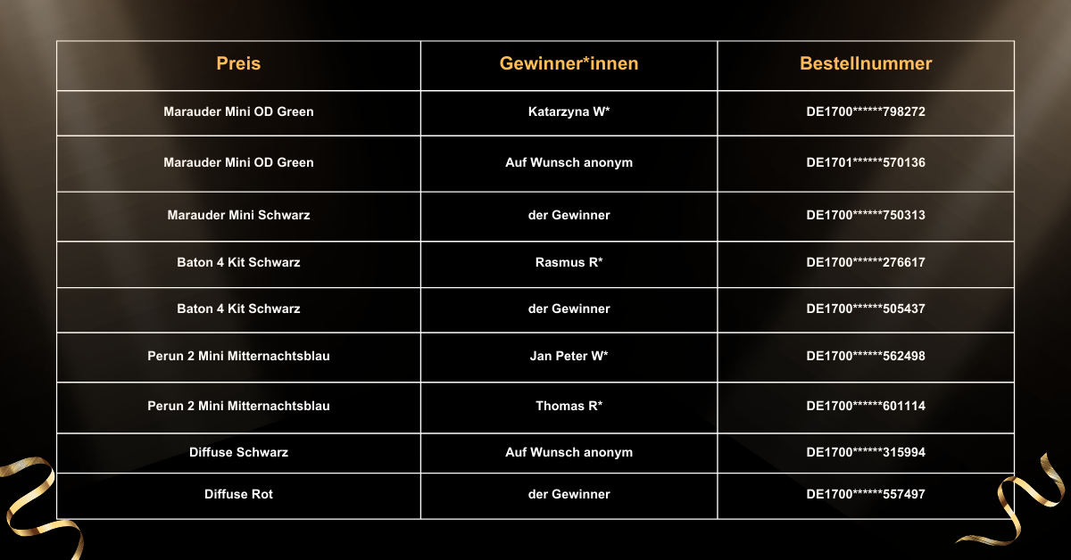 Olight Black Friday ist zu Ende. In diesem Gewinnpsiel haben insgesamt 30 Gewinner*innen gewonnen. Hier ist die Gewinnbenachrichtigung. Herzlichen Glückwunsch! Wir haben schon die Gewinner*innen über die E-Mail-Adresse newsletter@olightstore.de kontaktieren.