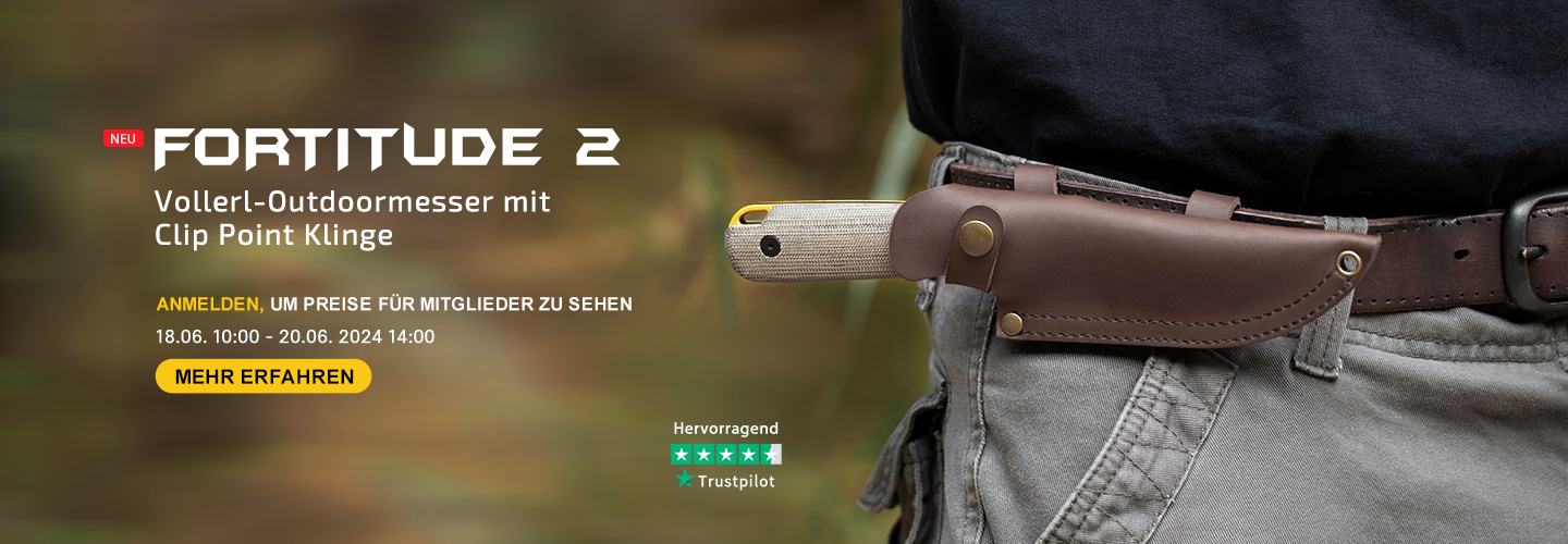 Das Fortitude 2 ist ein Messer mit feststehender Klinge und einer Vollerlklinge aus 3,7mm starkem CPMS35VN Pulverstahl mit einer mattschwarzen Titanbeschichtung. Die robuste, 3,7mm starke Klinge gleitet dank Flachschliff gut durchs Schnittgut. Die Griffbeschalung besteht aus Micarta in OD Green und gelbem G10 und sorgt für zusätzlichen Halt. Für einen einfacheren Transport ist es mit einer zweilagigen Lederscheide ausgestattet, die sowohl horizontal als auch vertikal am Gürtel getragen werden kann.