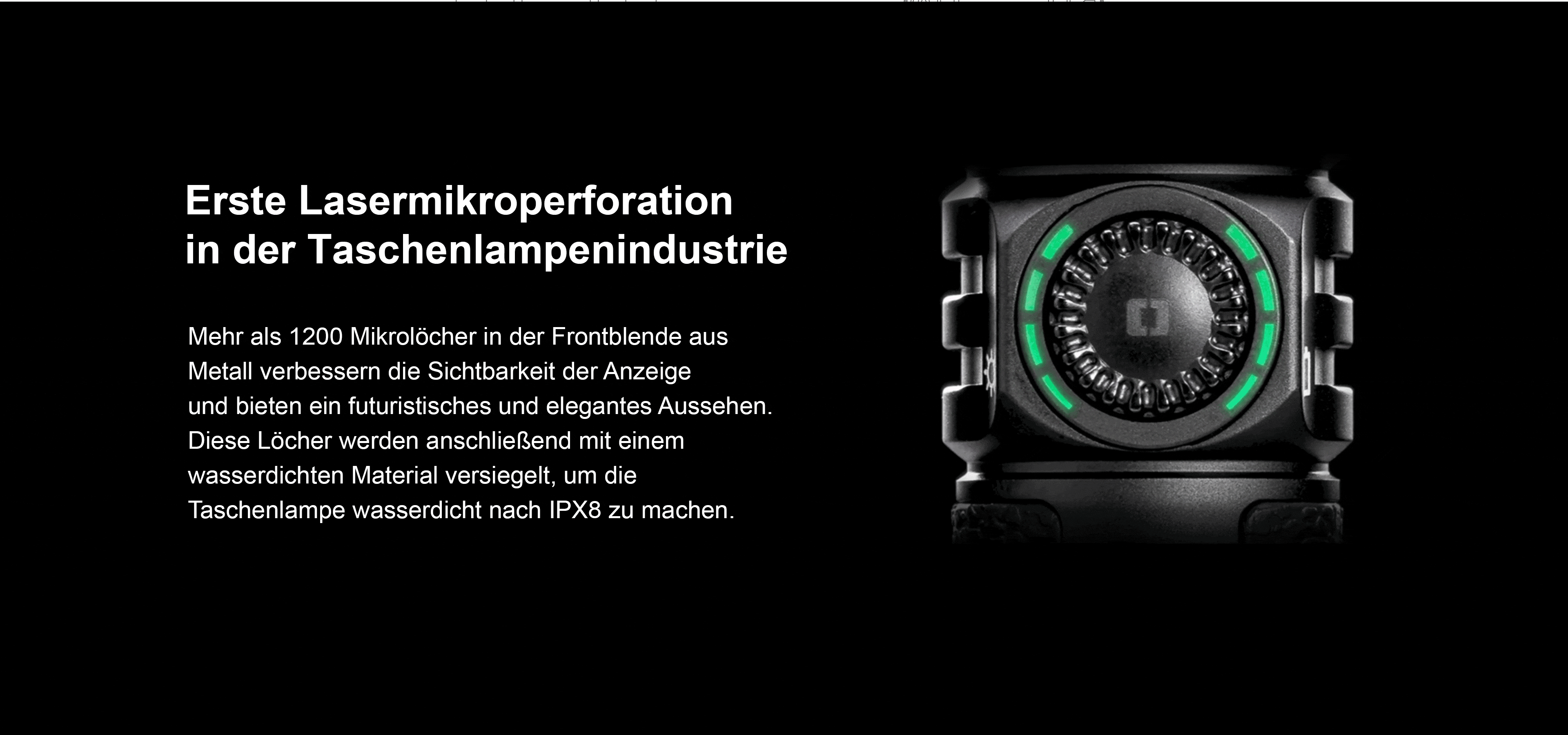 Das verborgene Dashboard rund um den Schalter ist ein echtes technisches Meisterwerk. Olight setzt hier erstmals in der Taschenlampen-Industrie auf die Laser-Mikroperforation: Über 1.200 winzige Mikrolöcher in der Metall-Frontblende ermöglichen es, dass die LED-Indikatoren elegant durch das Gehäuse leuchten, während die Lampe IPX8-wasserdicht bleibt.