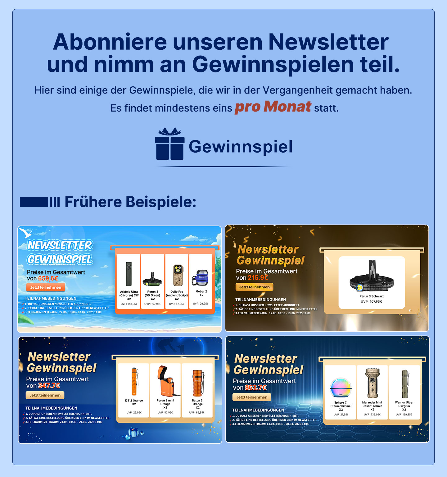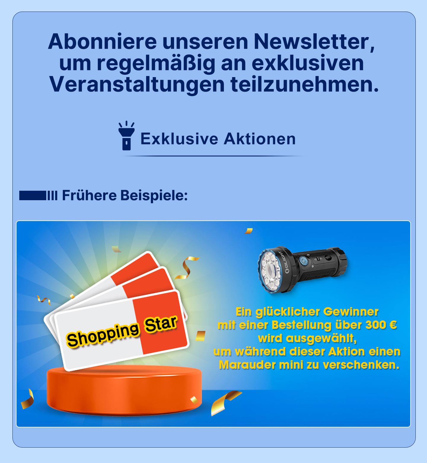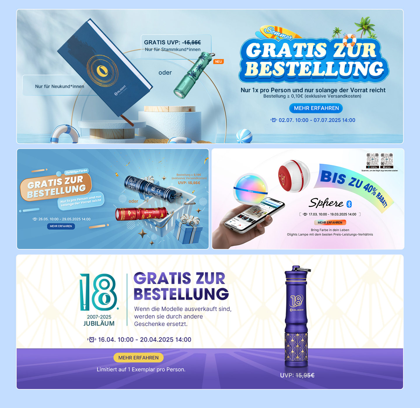 Taschenlampen-Tipps und Anleitungen (129)Taschenlampen Tests und Reviews (59)Nachrichten und Aktualisierungen (97)Vergleich der Produkte (25)Veranstaltung & Flashsale (109)Marauder Serie (1)ArkPro Serie (2)Einführung eines neuen Produkts (3)Flash Sale (0)Olight Wohltätigkeit (12)